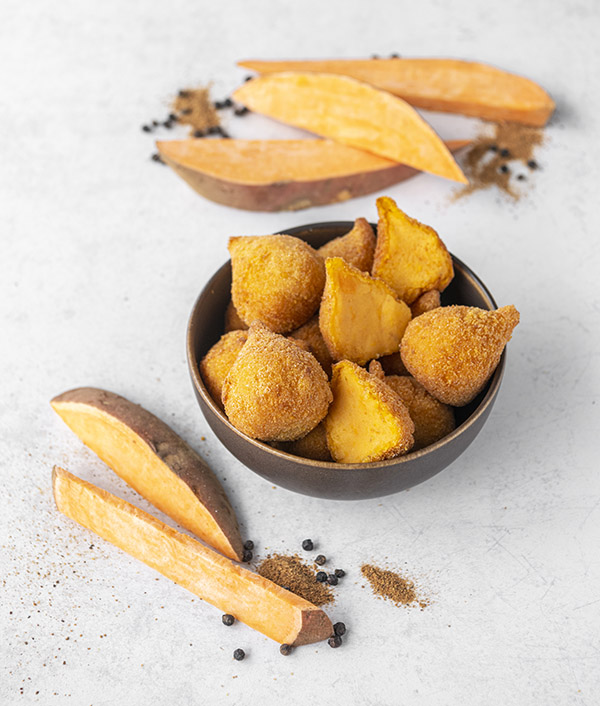Een kroketje in de vorm van een peertje gevuld met een heerlijke smeuïge puree van zoete aardappel.