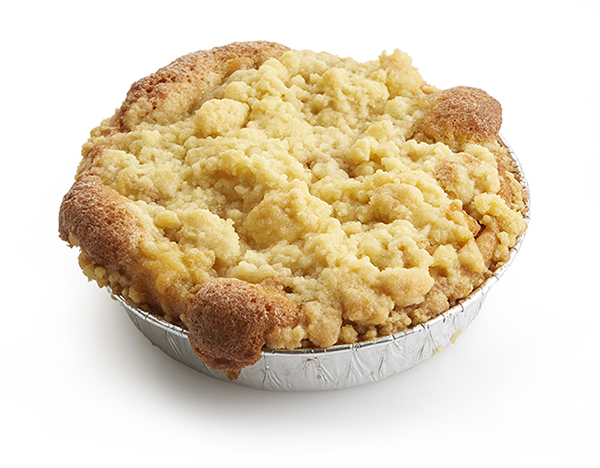 Taartje met een bodem van koekjesdeeg, gevuld met een smeuïge frangipanevulling en stukjes appel, afgewerkt met een crumble op basis van echte boter.